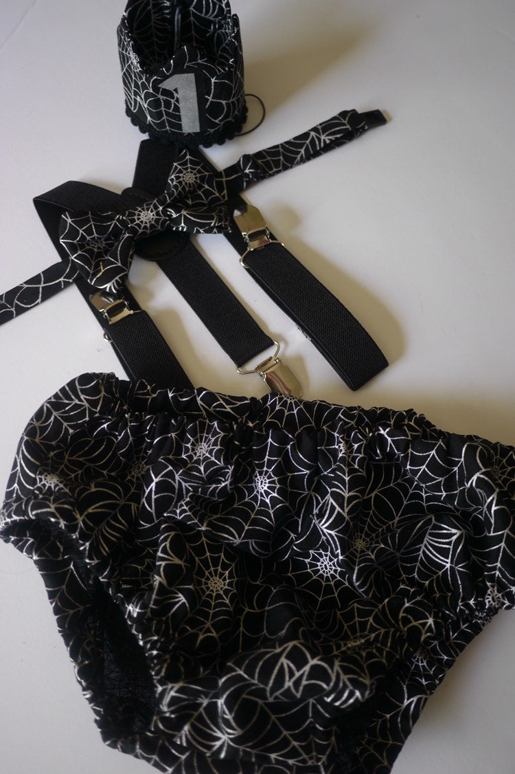 1st Birthday boy cake smash Outfit Bow tie bloomers Suspenders halloween cake smash, boy outfit,bloomers,diaper cover, spiderweb cake smash