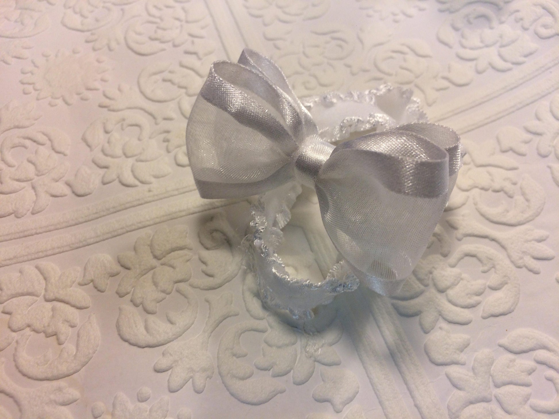 A white peek-a-boo satin, double simple bow on a white, frilly, stretchy headband. Ideal for baptisms, communions, birthdays and weddings! Made with love and care for your beautiful baby girl!