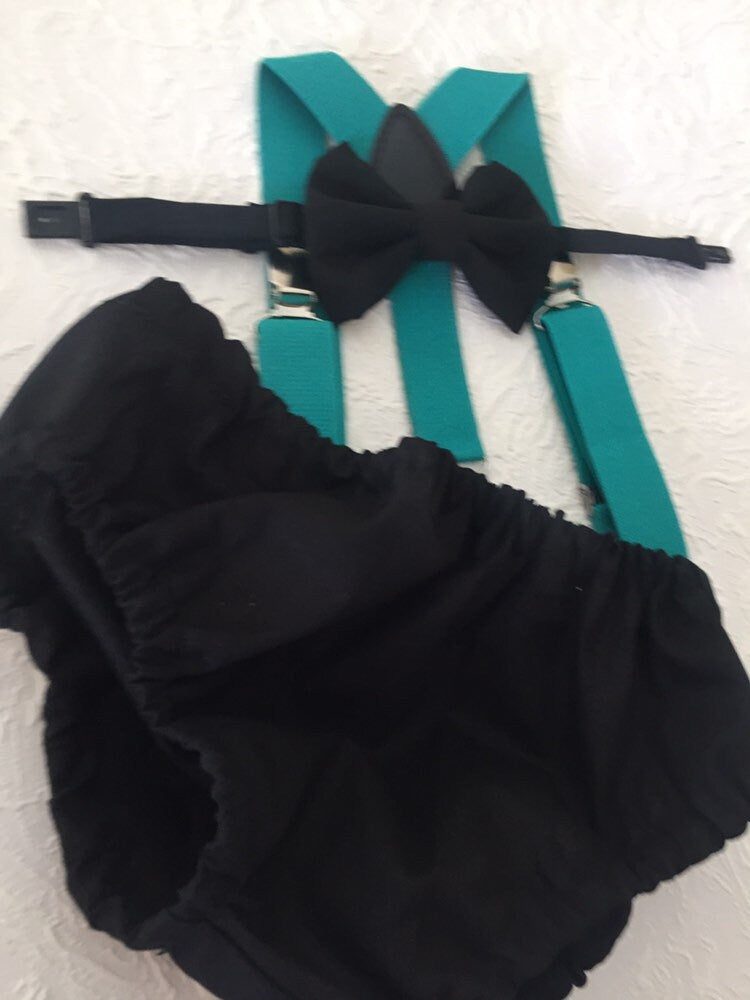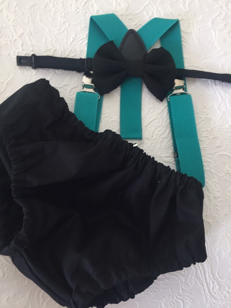 3 piece baby boy Cake Smash set: turquoise suspenders, black bow tie and bloomers