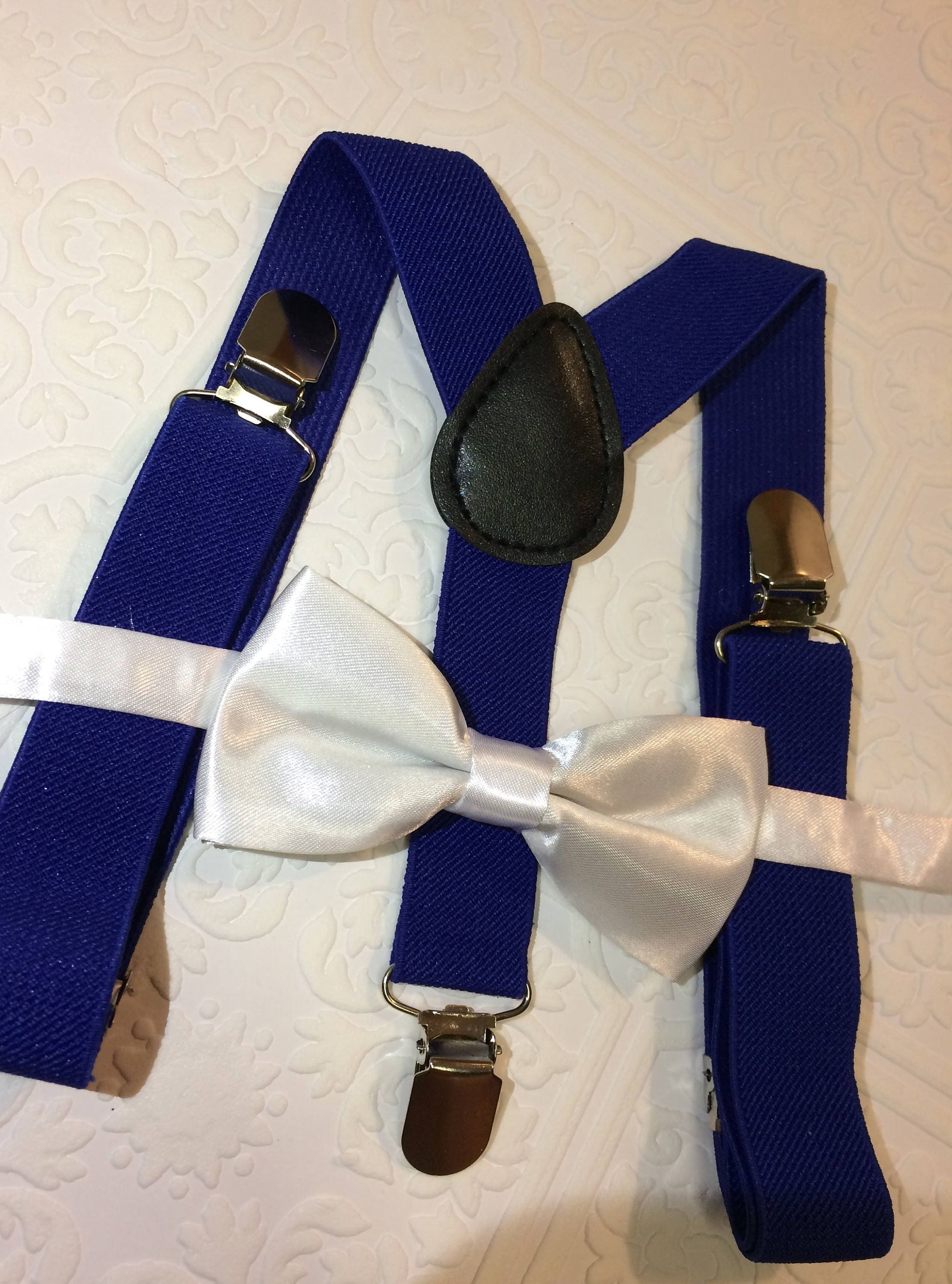 Classic royal blue Suspenders and trendy satin white bow tie- Ready to Ship!