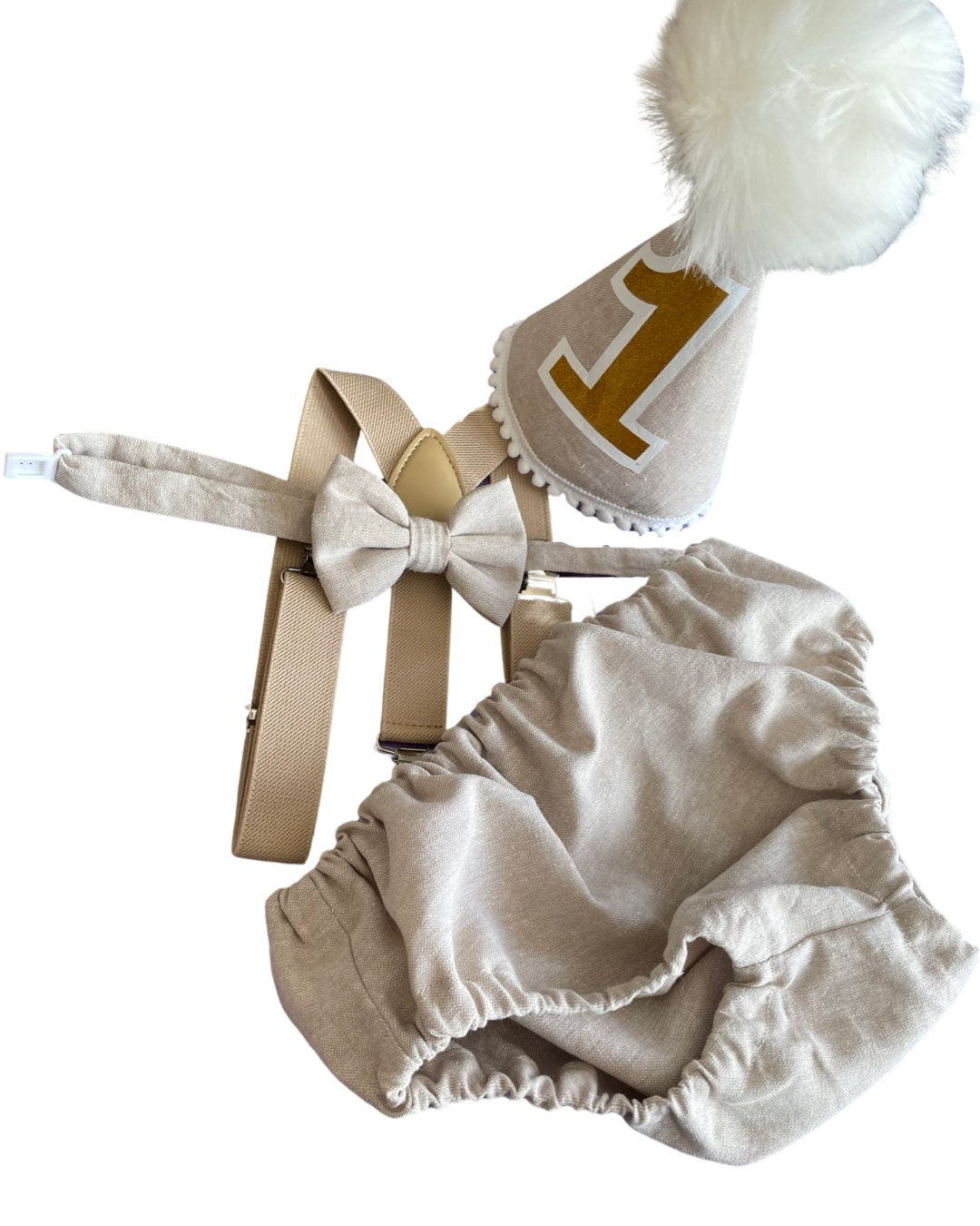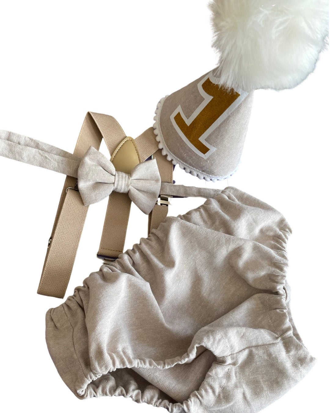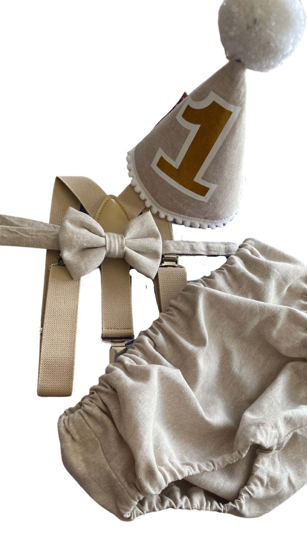 4 piece baby boy set: bow tie, hat, beige suspenders and matching bloomers
