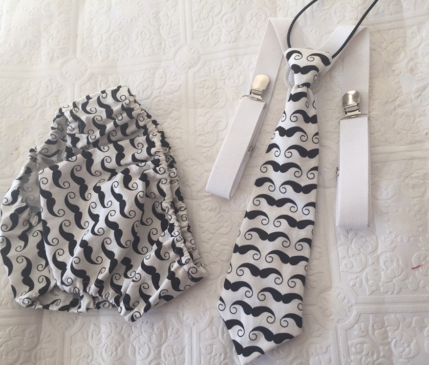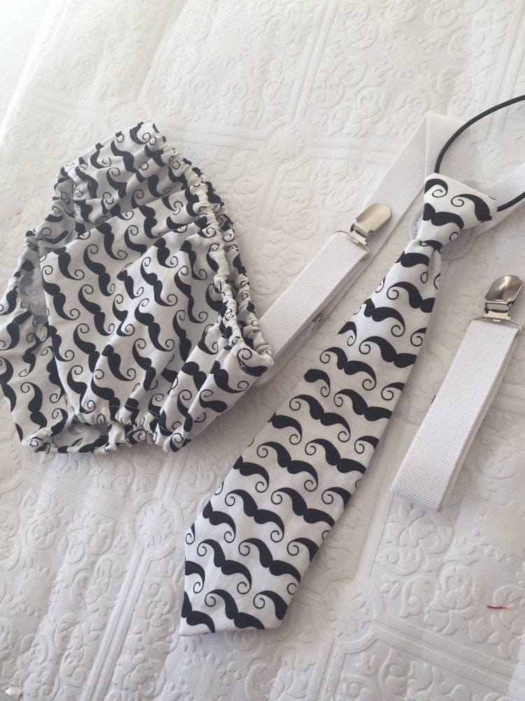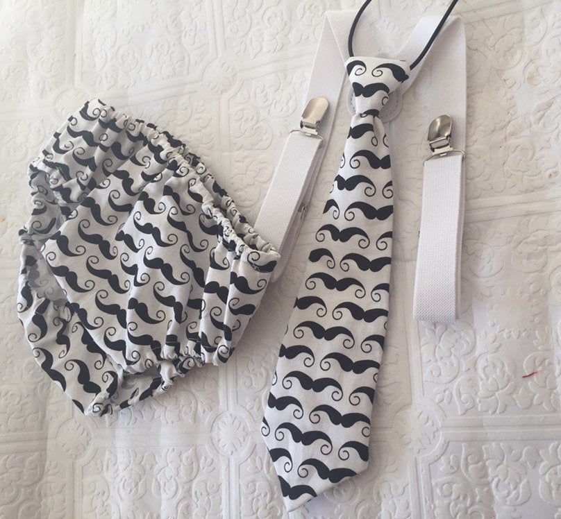 3 piece baby boy Cake Smash set: black suspenders, moustache tie and bloomers