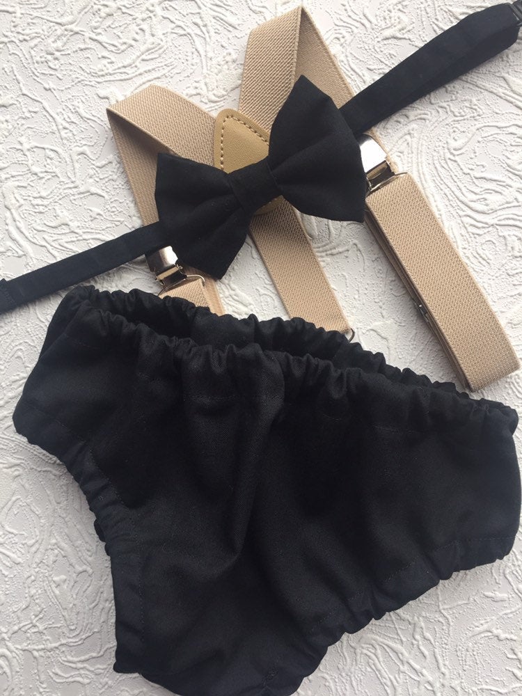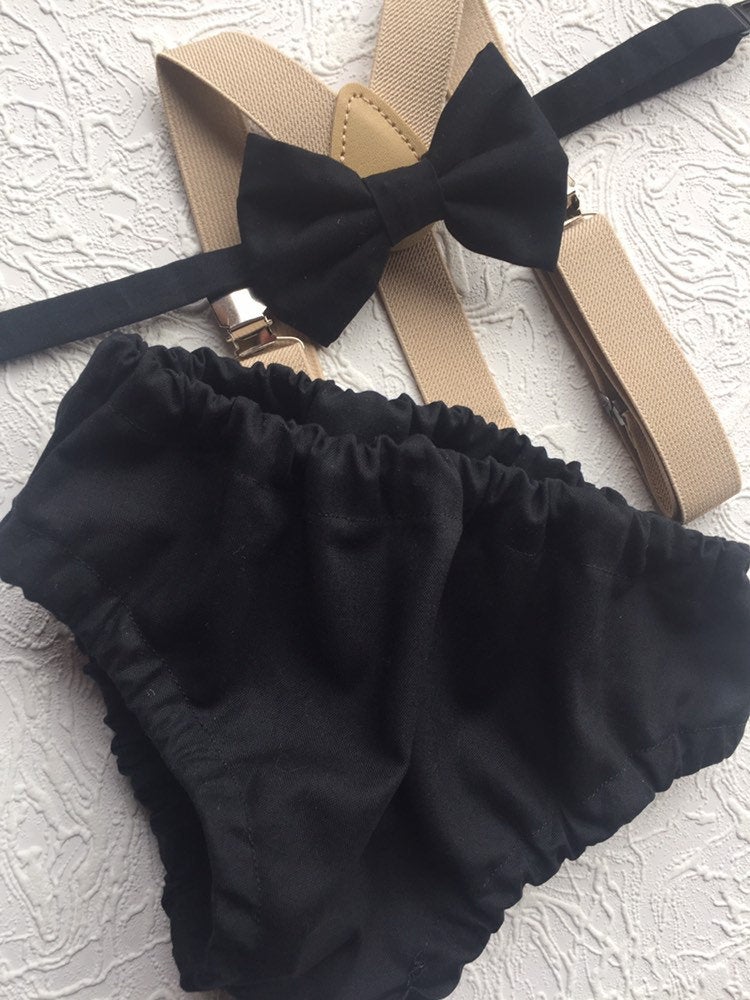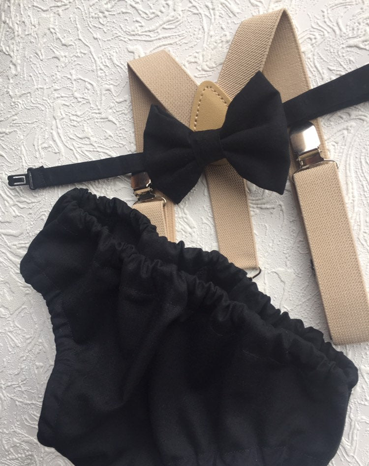 3 piece baby boy Cake Smash set: beige suspenders, bow tie and bloomers