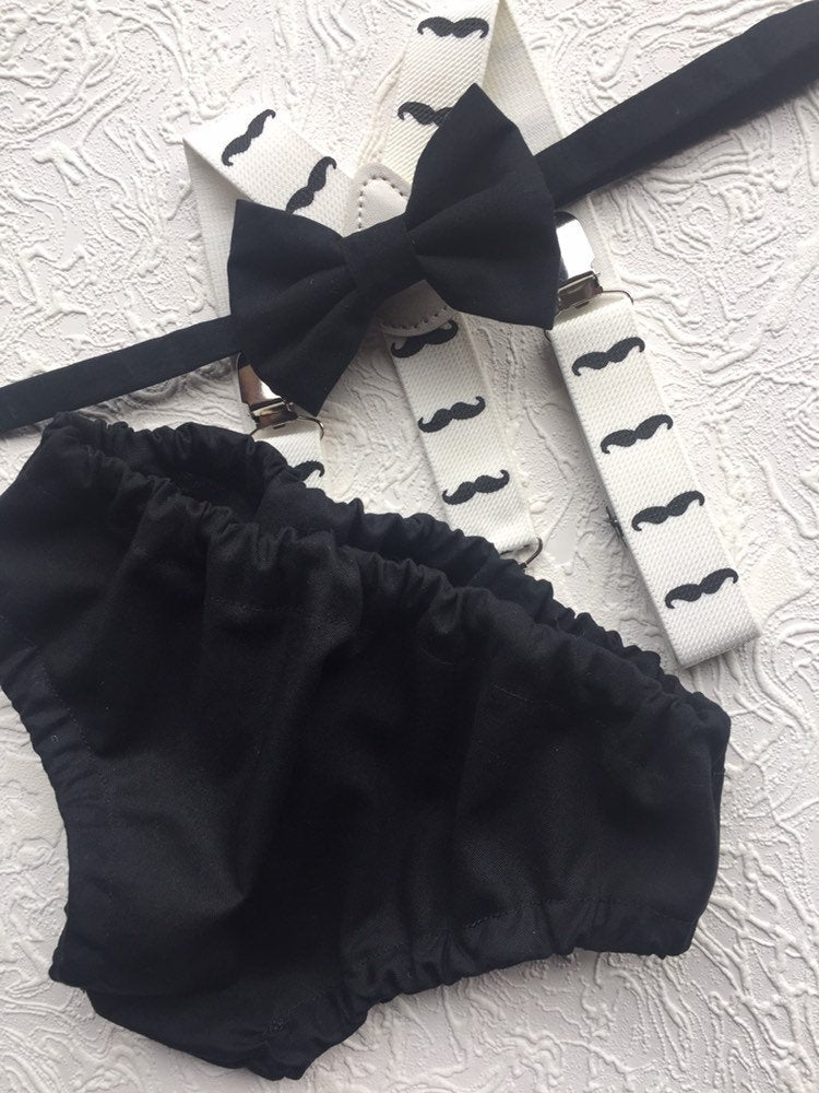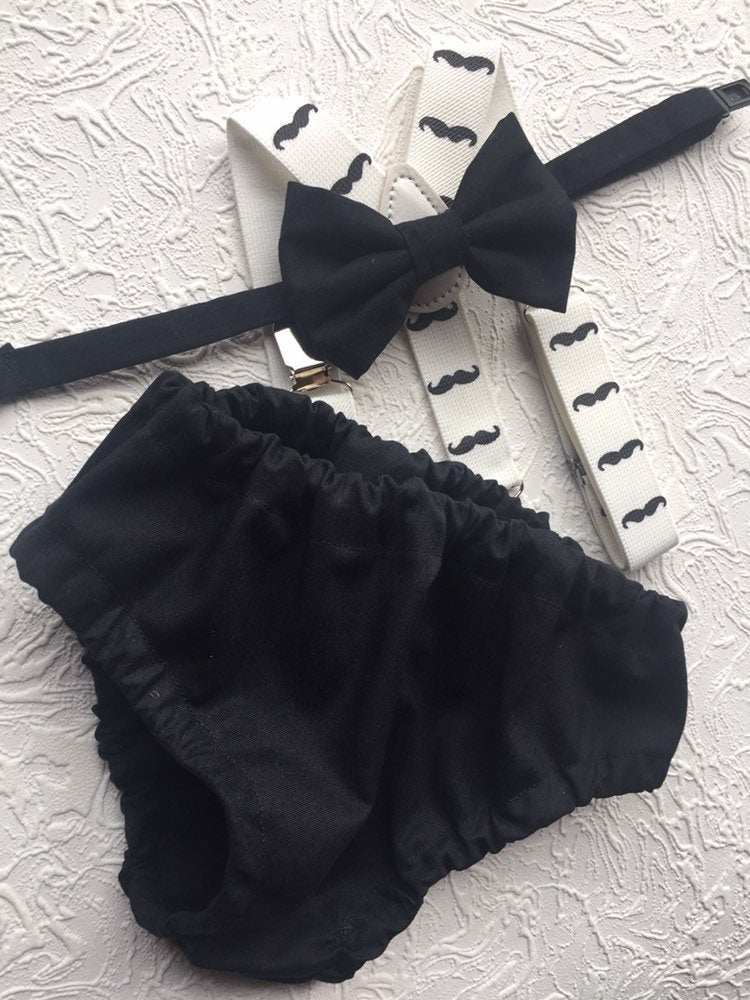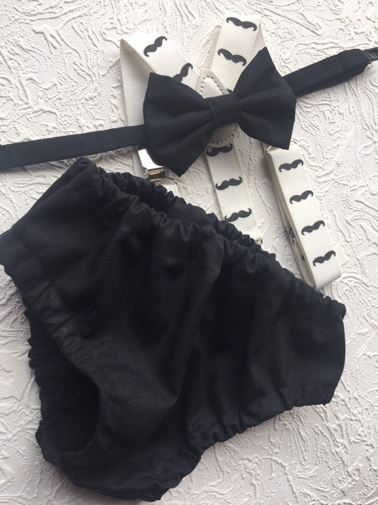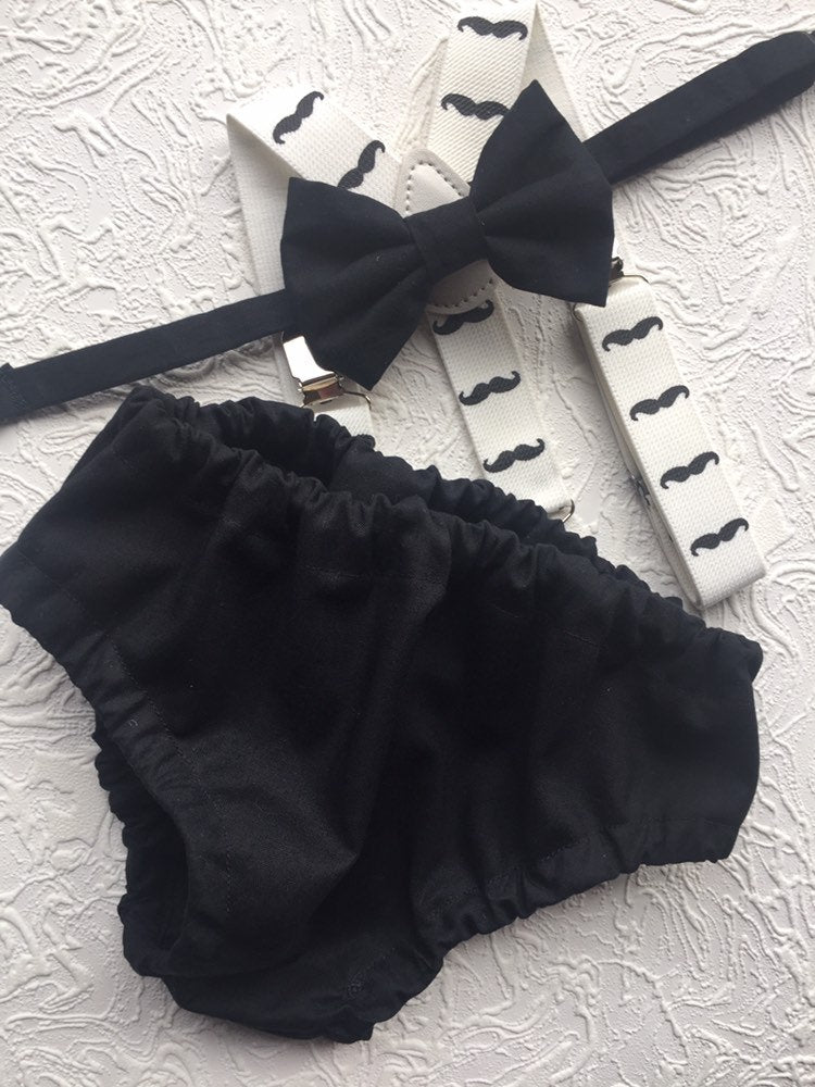 3 piece baby boy Cake Smash set: black moustache suspenders, bow tie and bloomers