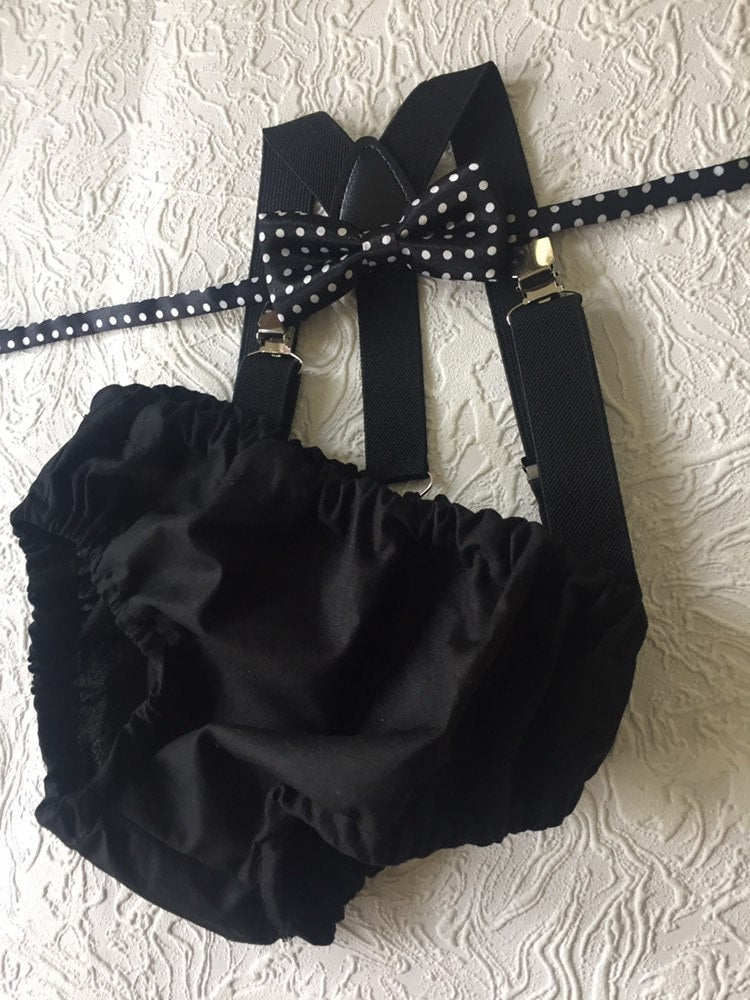 3 piece baby boy Cake Smash set: black suspenders, black bow tie and bloomers