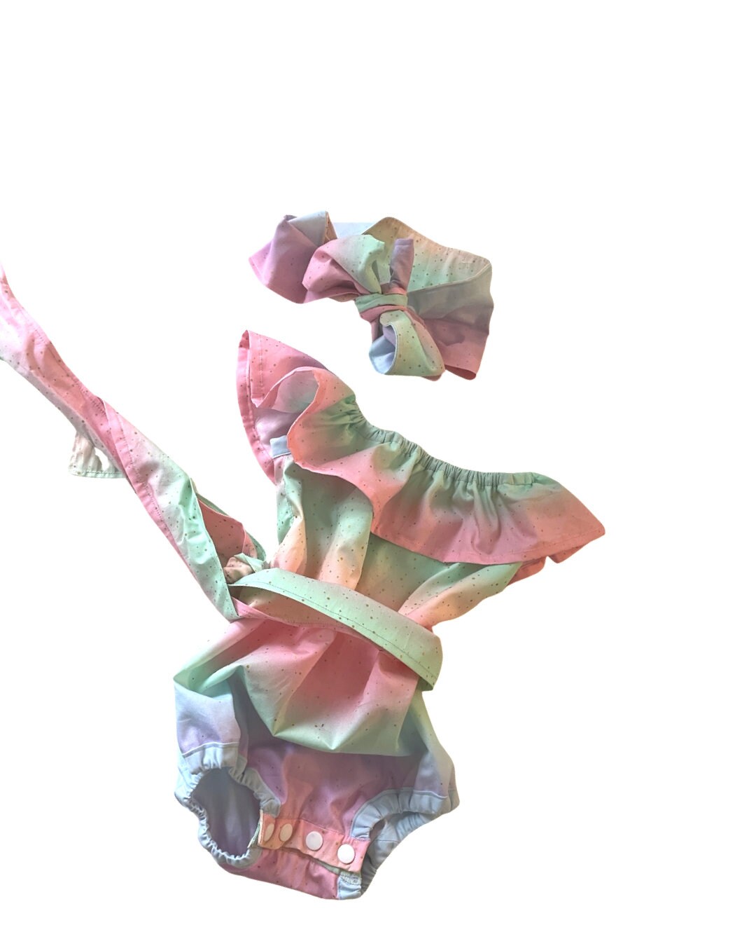 This original pastel rainbow ruffle romper is made out of 100% cotton fabric- perfect for photos. It comes with a sash and an option to purchase a headband. A beautiful ruffle romper for a very special little girl!