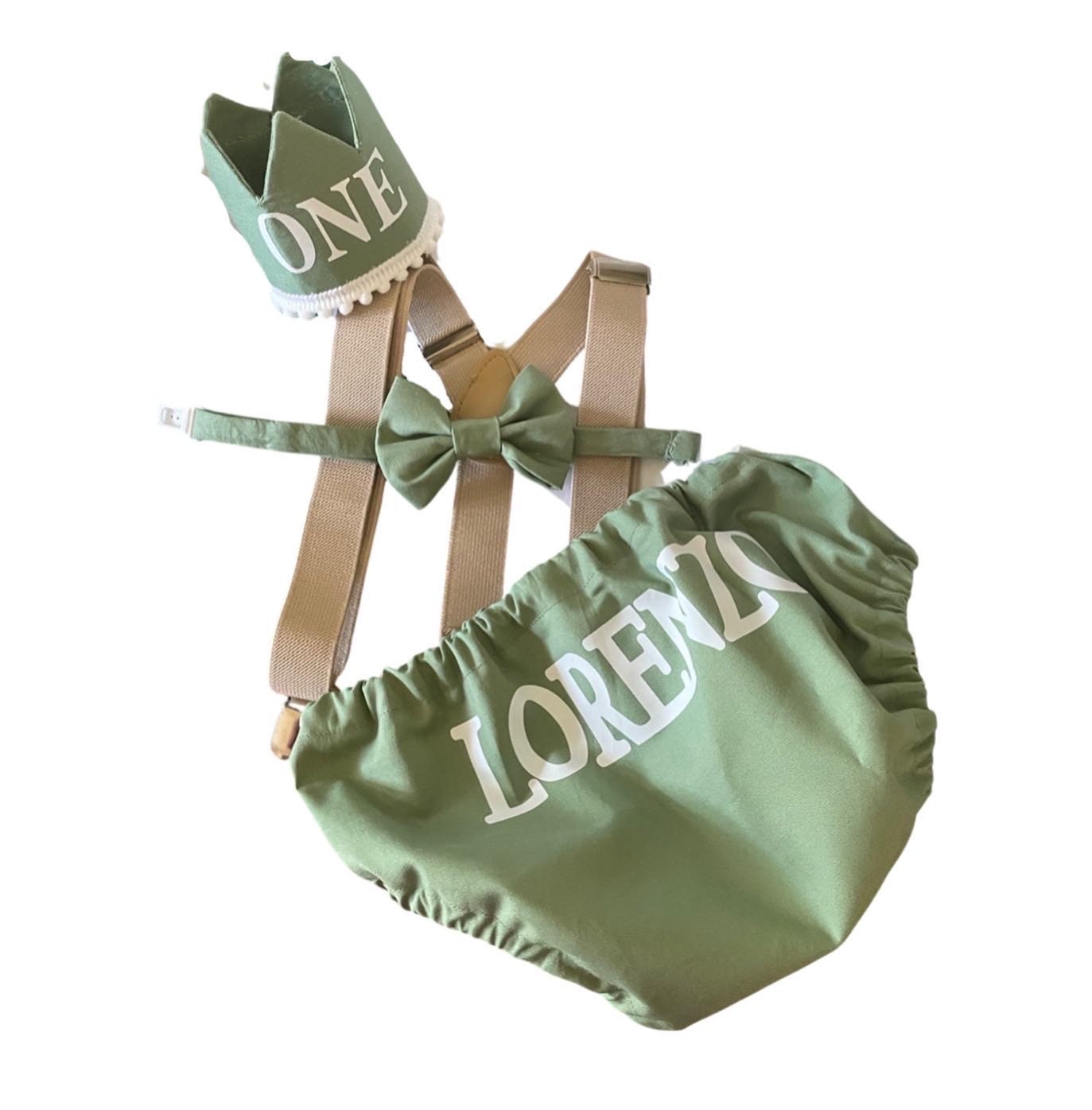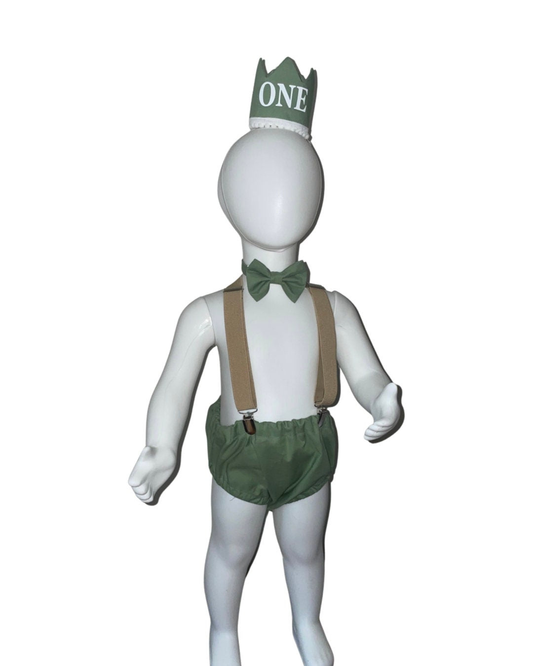 4 piece baby boy Baby olive set: bow tie, crown suspenders and matching bloomers