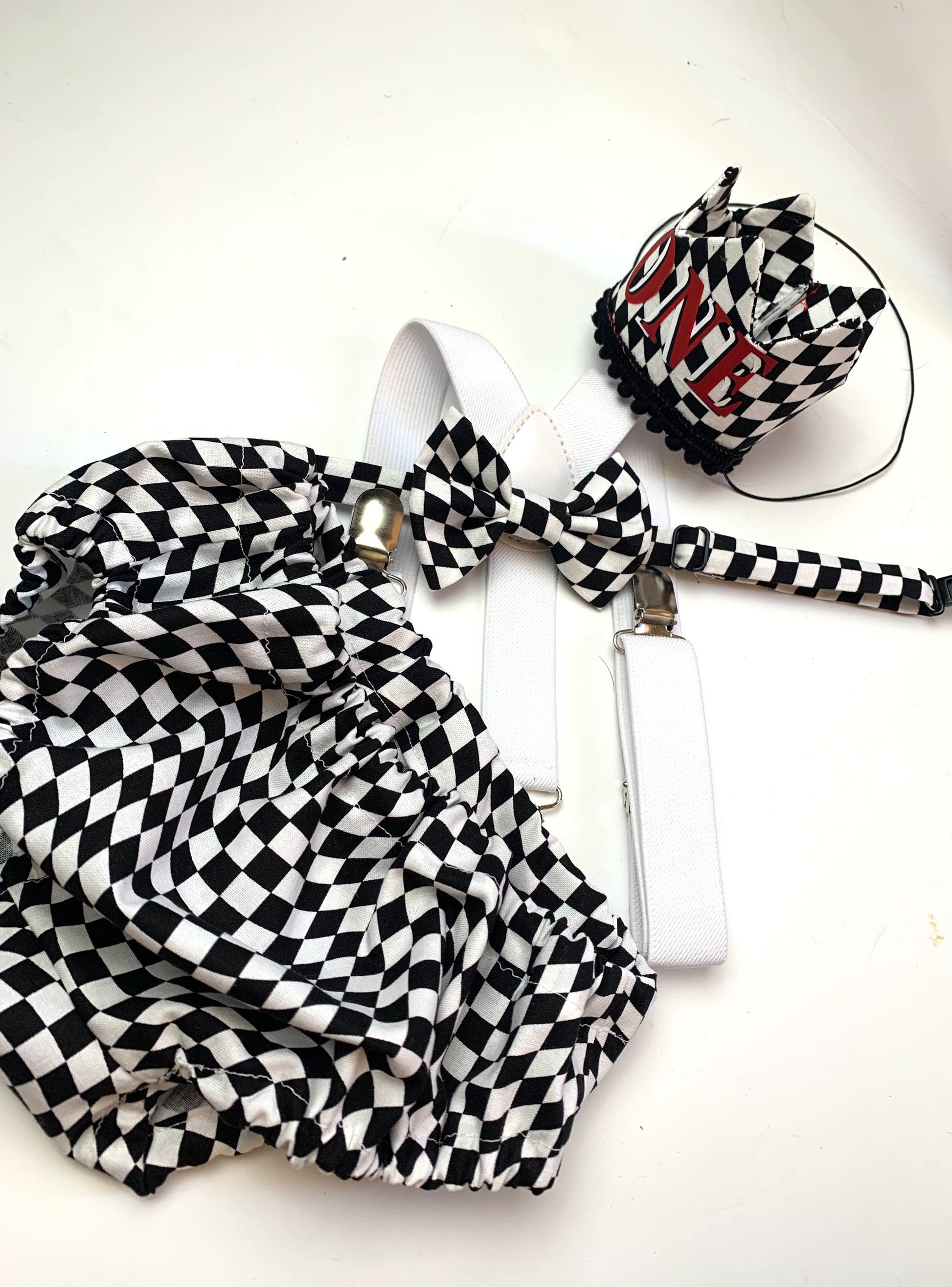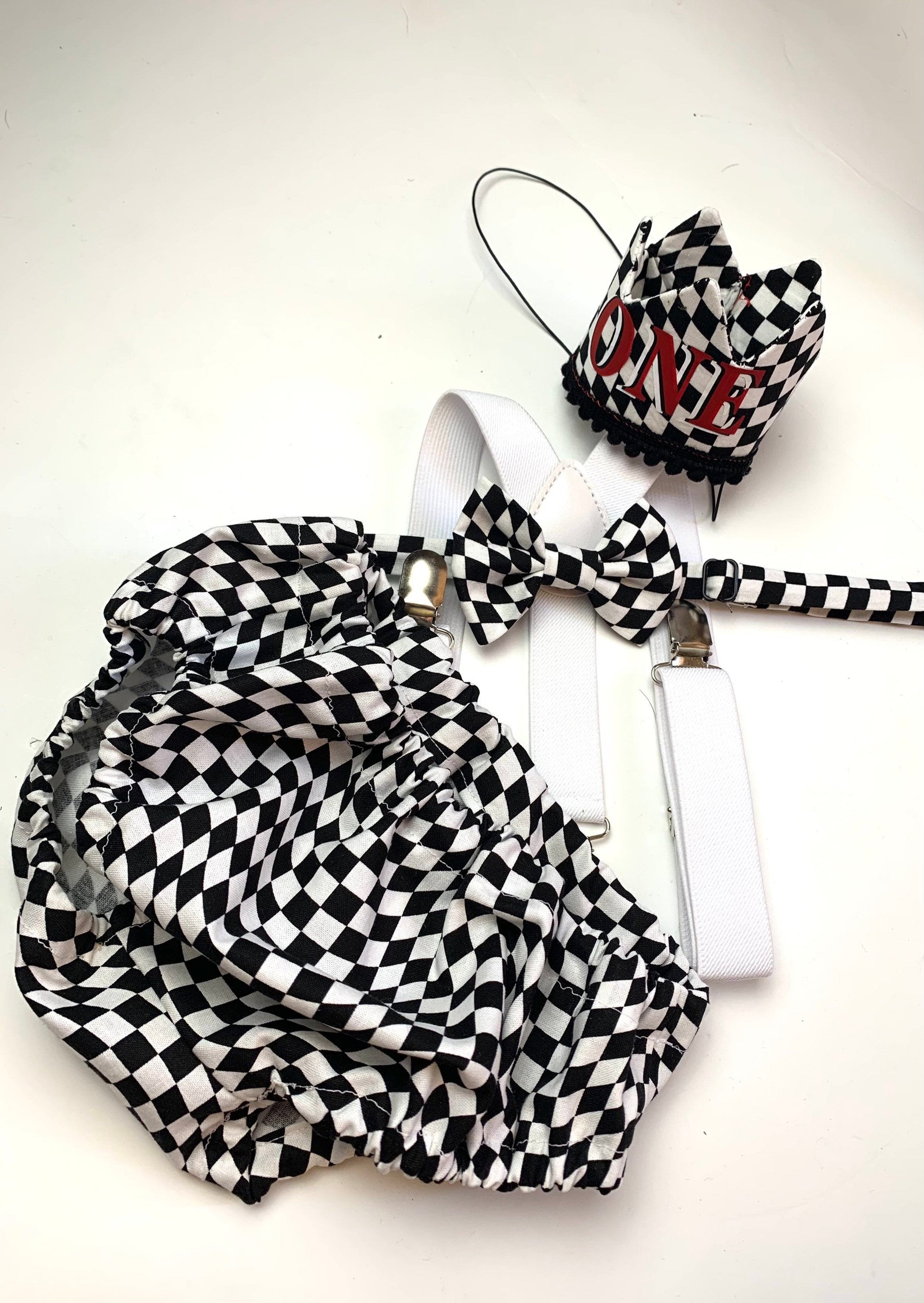 4 piece baby boy Cake Smash set: crown, white suspenders, bow tie and bloomers