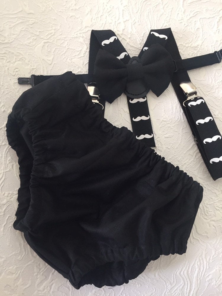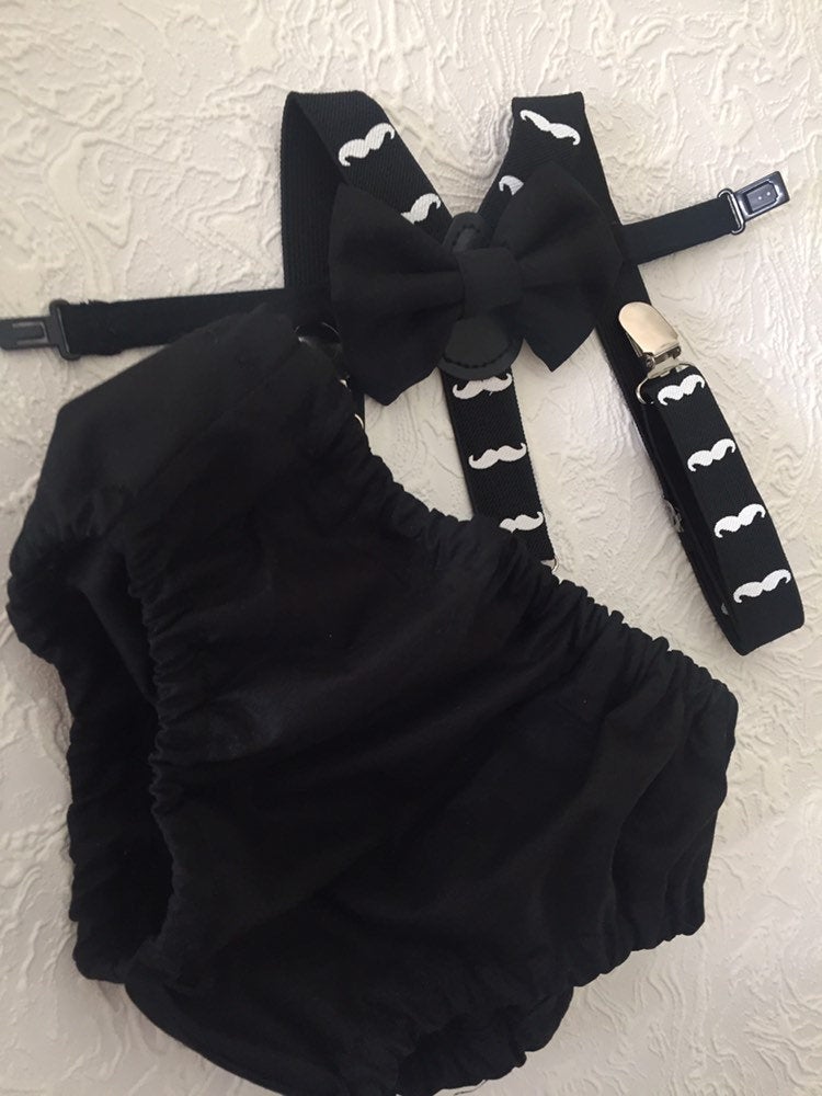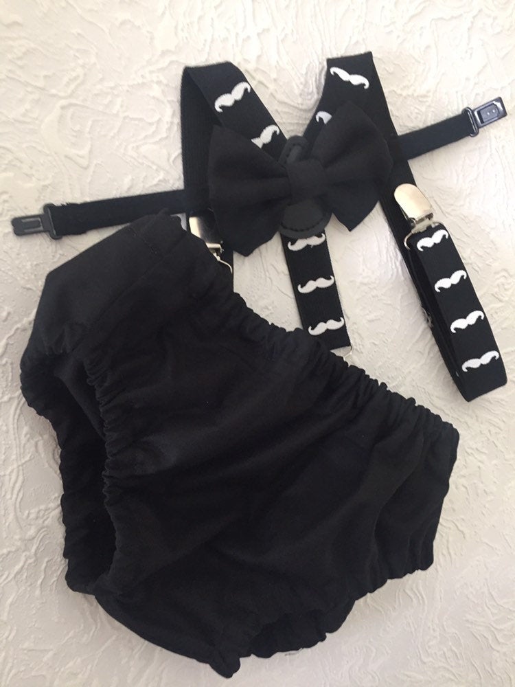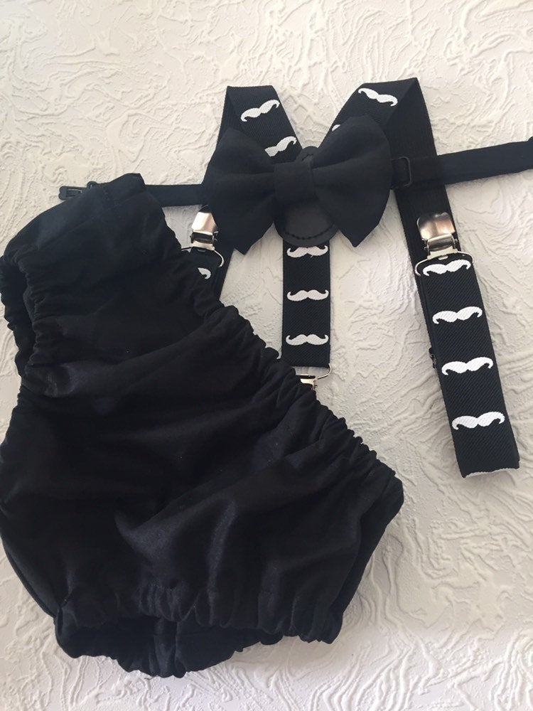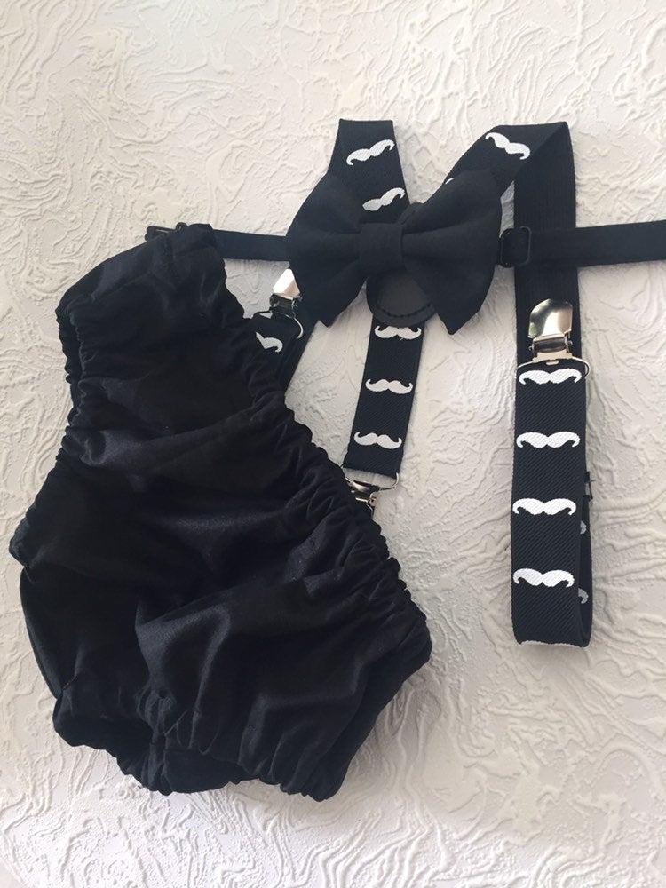 3 piece baby boy Cake Smash set: moustache suspenders, black bow tie and bloomers