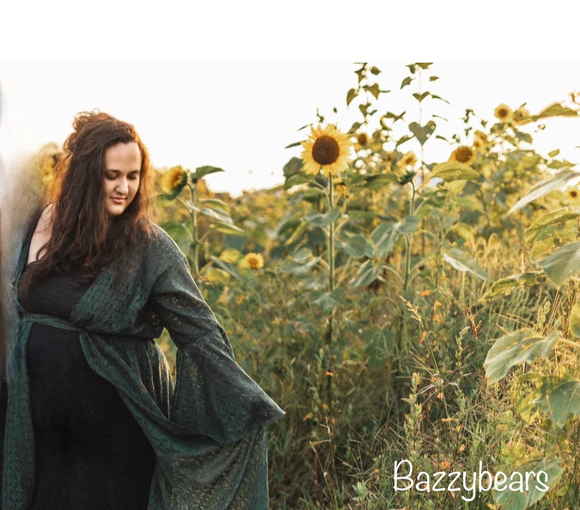 This is a flared, long sleeve ruffle duster that is knee high or floor length - perfect for lots of movement and comfort. The long sleeves have a circular bell shape. Comes with a belt. A beautiful gift, maternity duster, spring/summer /fall or even winter duster for a very special woman who enjoys comfort and beauty at home.