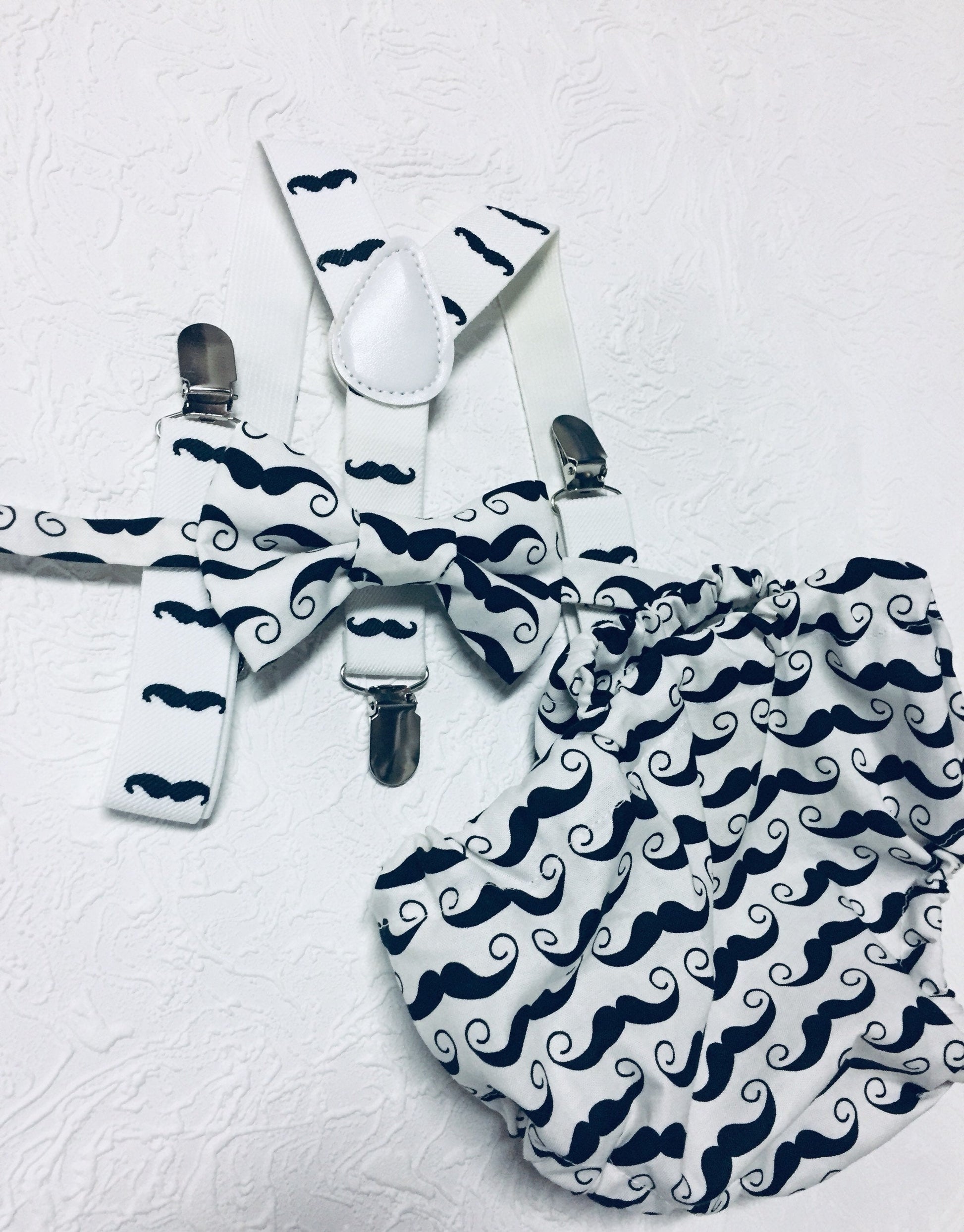 3 piece baby boy Cake Smash set: black suspenders, moustache bow tie and bloomers
