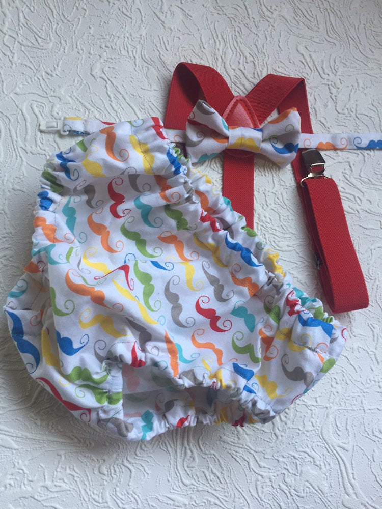3 piece baby boy Cake Smash set: red suspenders, moustache tie and bloomers