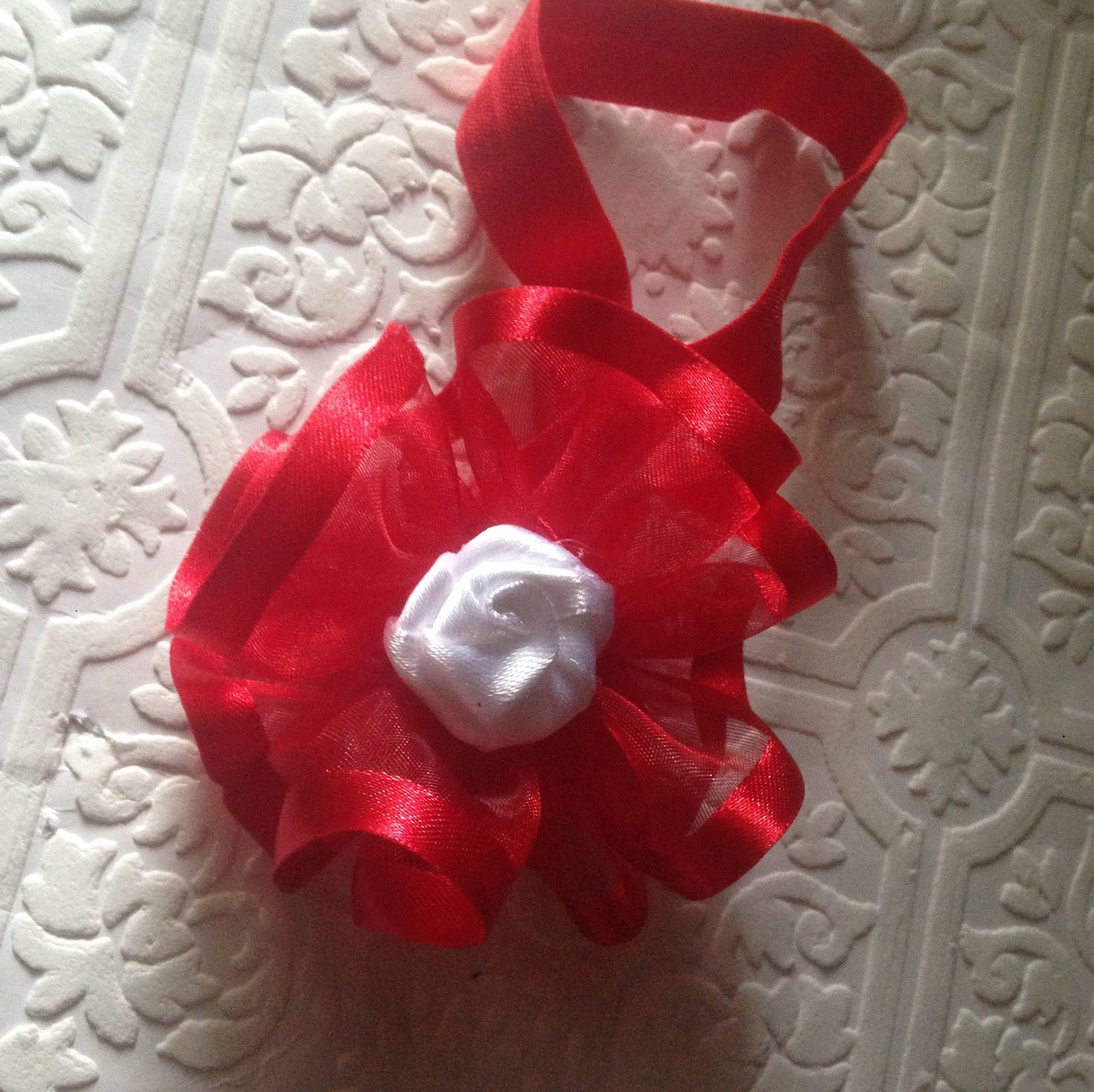 This beautiful red and white baby headband is breathtaking. Perfect for any Christmas holiday occasion. Made with soft ribbon and a white rose in the middle. It is attached to a red headband. Available in green or white bands as well. Make your baby the star of any holiday party!