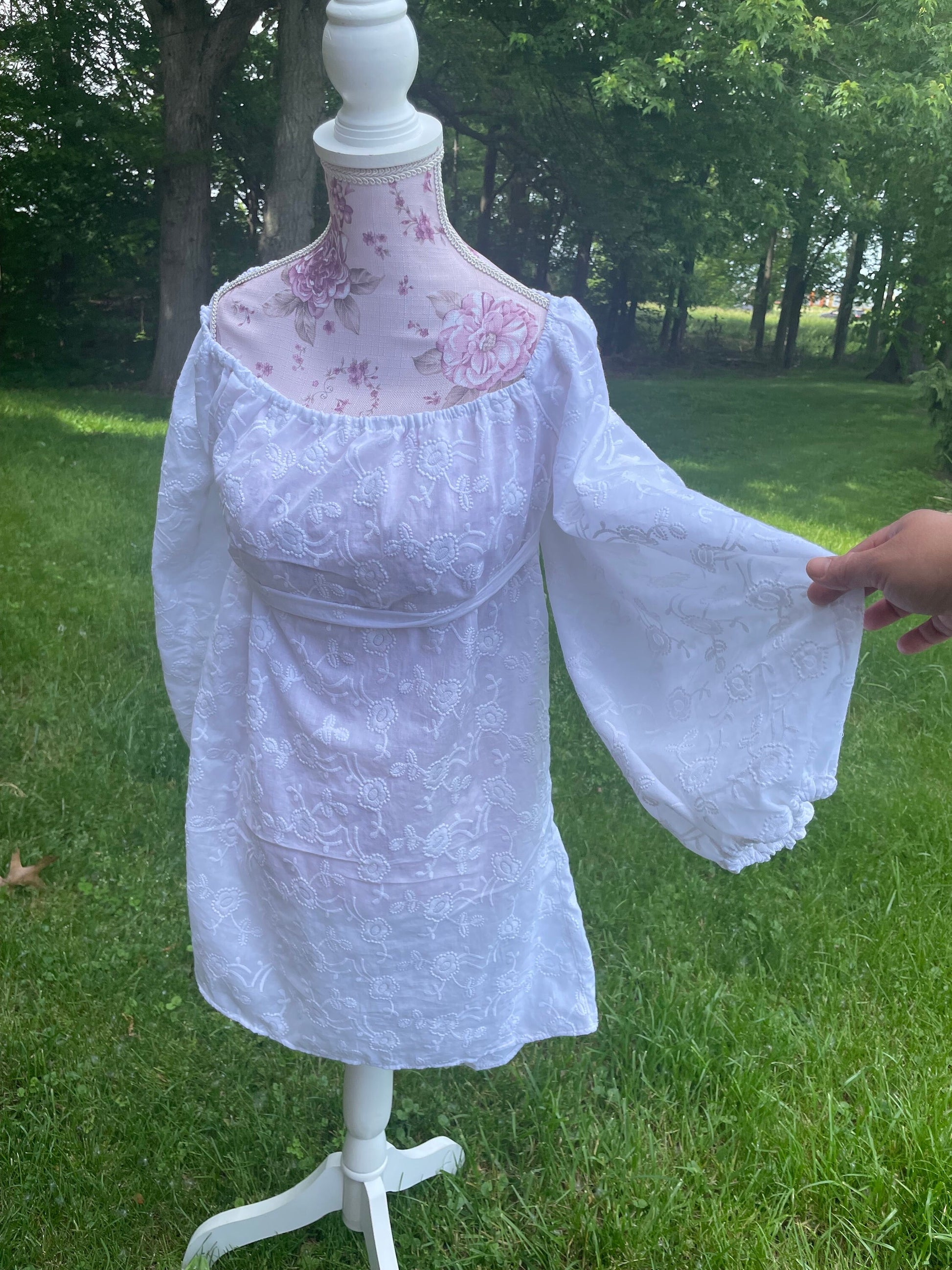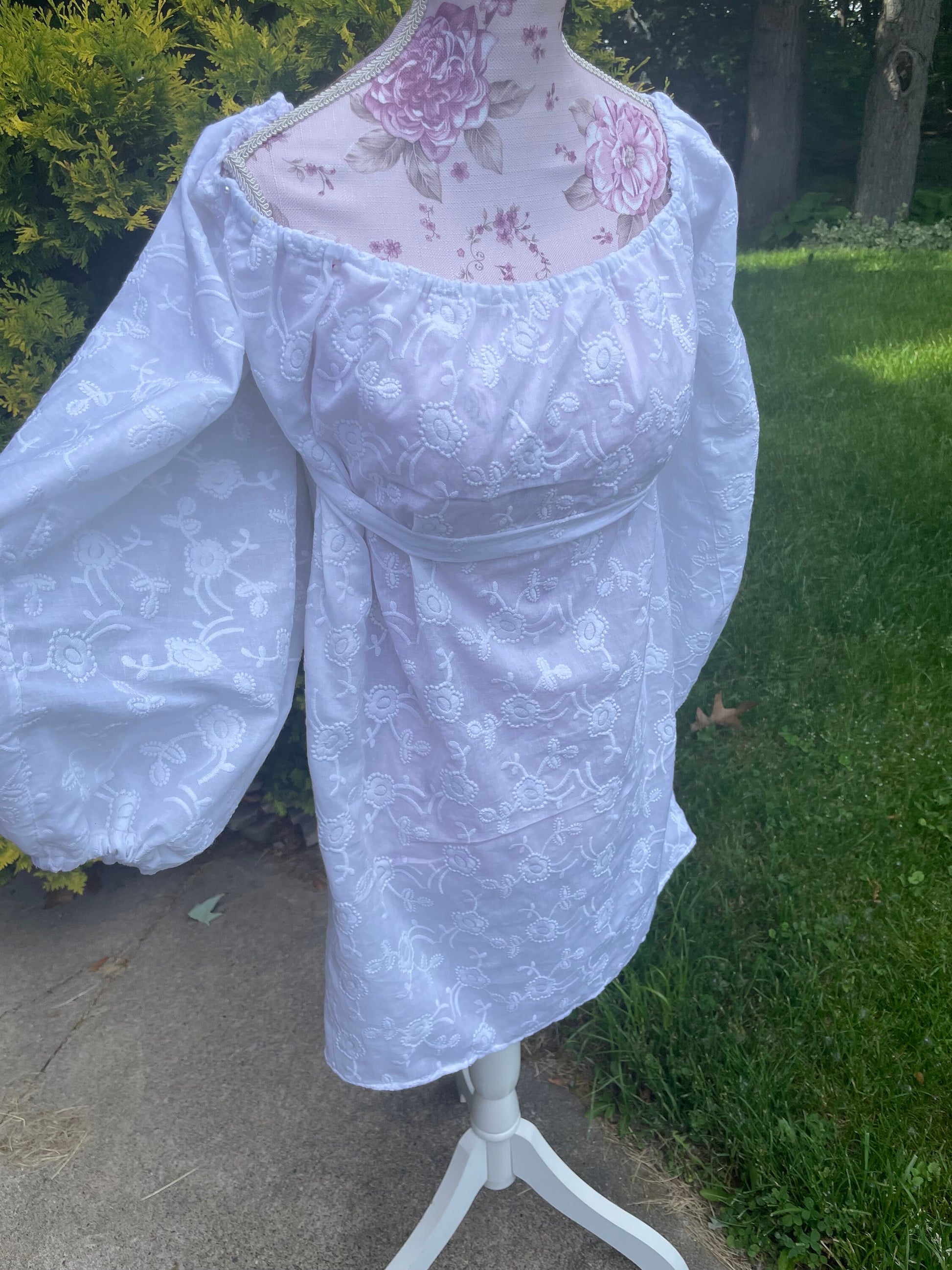 This spring/summer white embroidered print lantern sleeve is available as a top/ knee high dress or ankle length dress- perfect for lots of movement and comfort. The top of the shirt is off shoulder with a long puff sleeves. A beautiful top or dress for a woman who loves comfort and stylish!