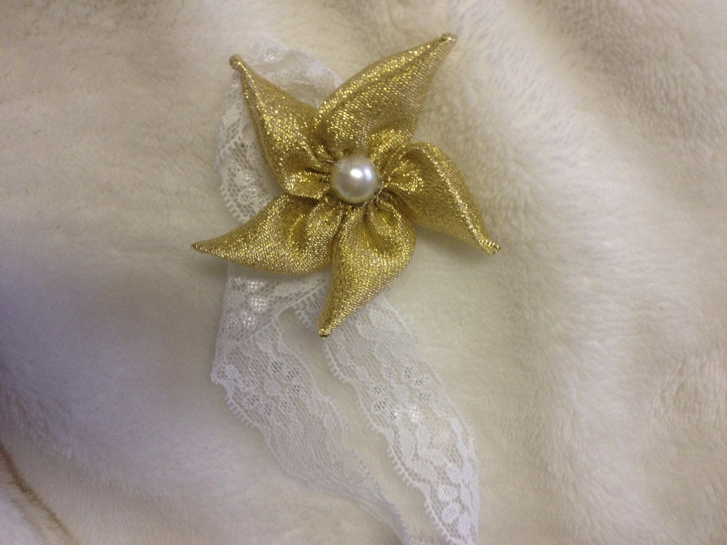 This simple yet stunning gold Christmas baby headband is meant to compliment your little ones dress without overpowering it. The single flower star looks elegant on a lacy white headband with a pearl centre. A lovely accessory for any special event.