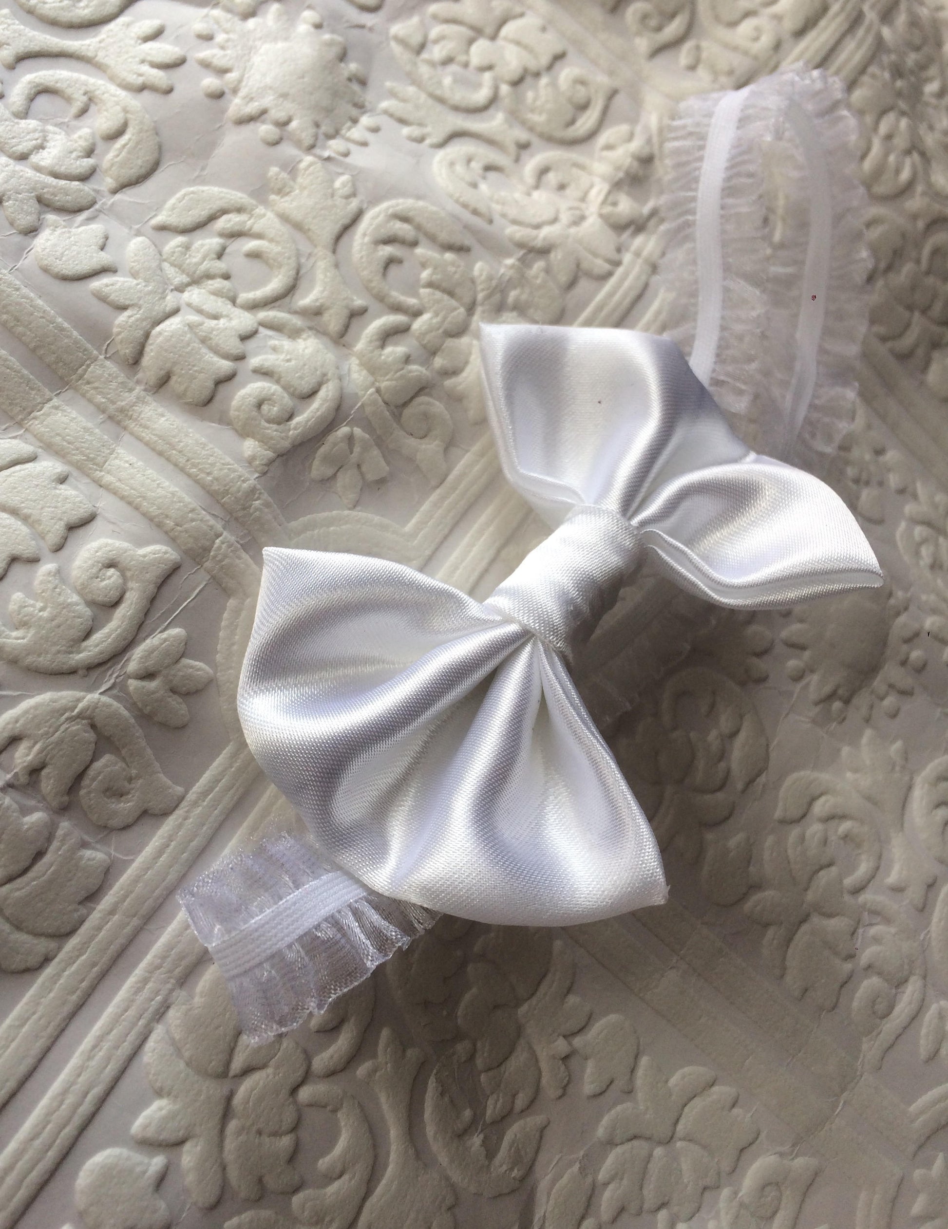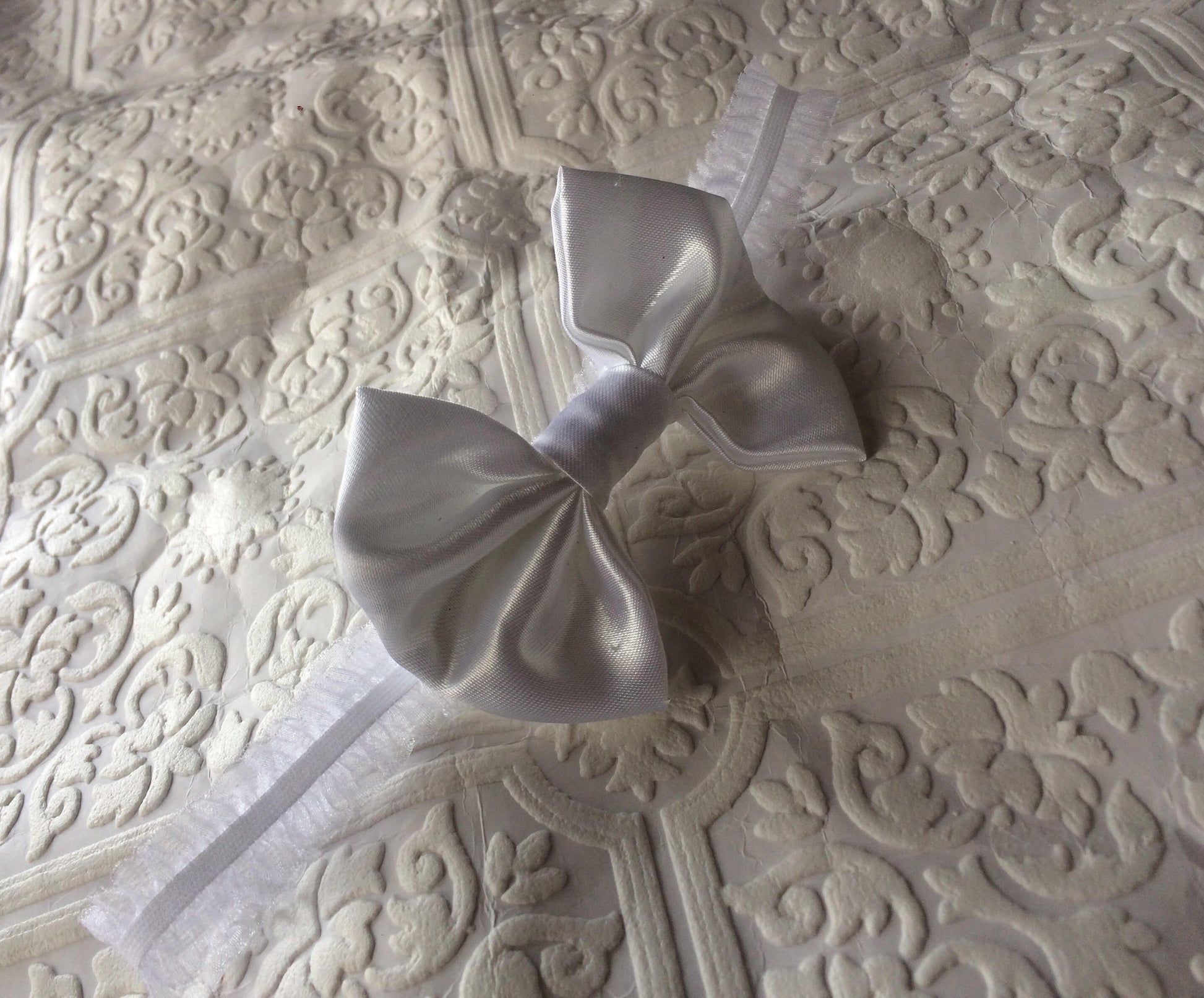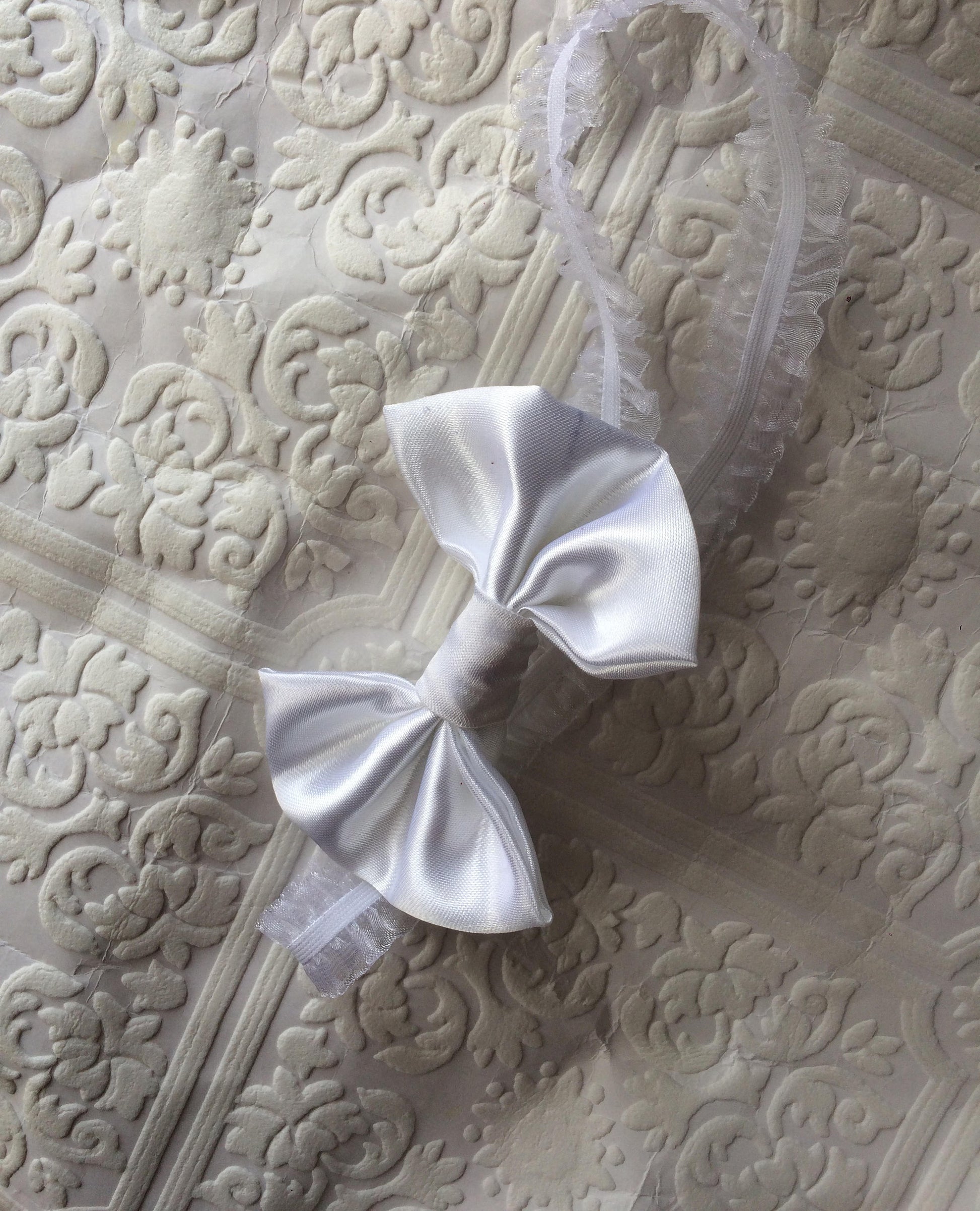 This beautiful baby headband is a lovely Christening/baptism/ newborn baby headband. White, Soft satin bow. Sits on a white frilly headband.